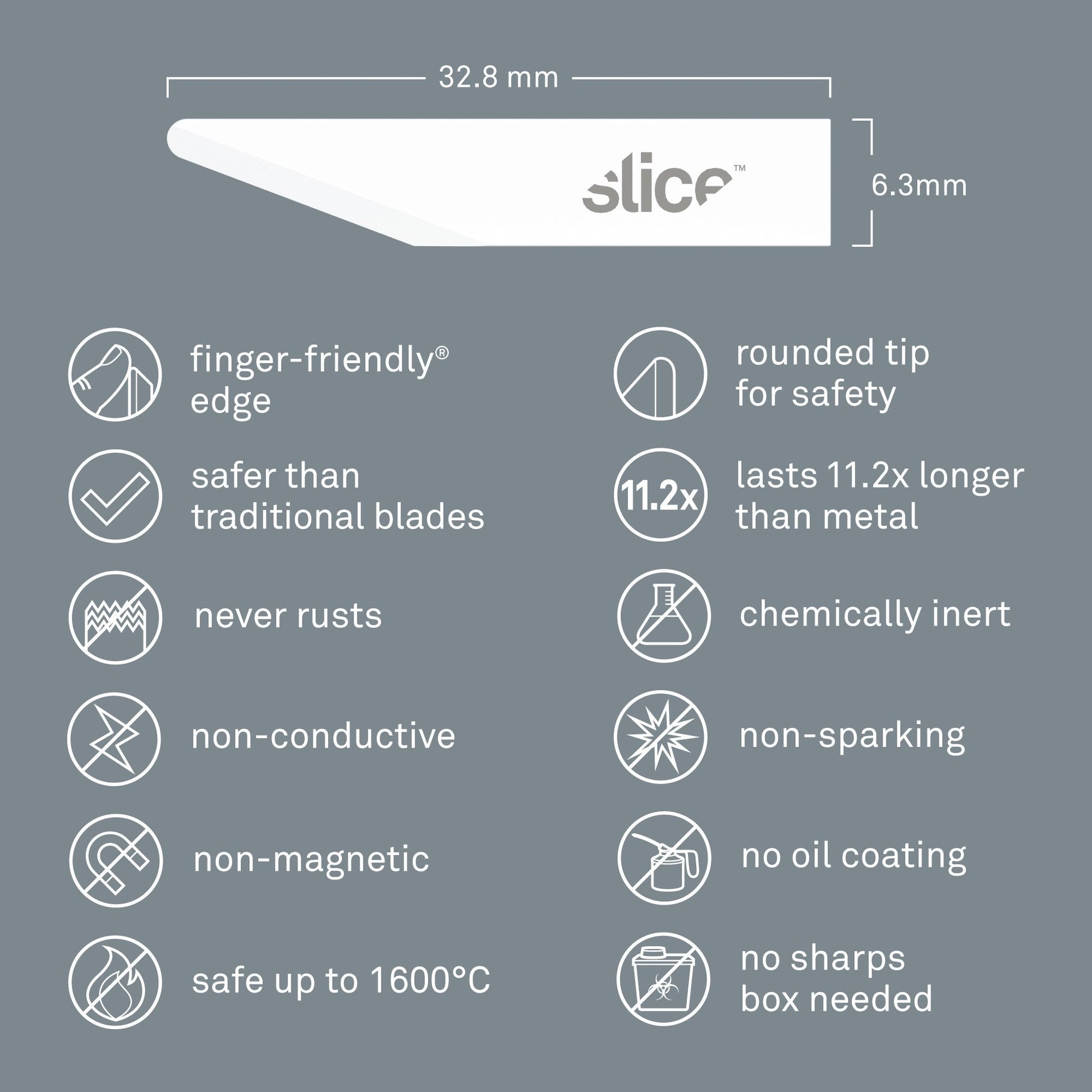 When it comes to craft knife blades, sizes don’t vary greatly. What sets Slice® craft blades apart is their finger-friendly® edge, which isn’t found on any other blade—neither metal nor ceramic. In addition, Slice uses an advanced ceramic material, which never rusts and does not require a special oil coating to maintain.
