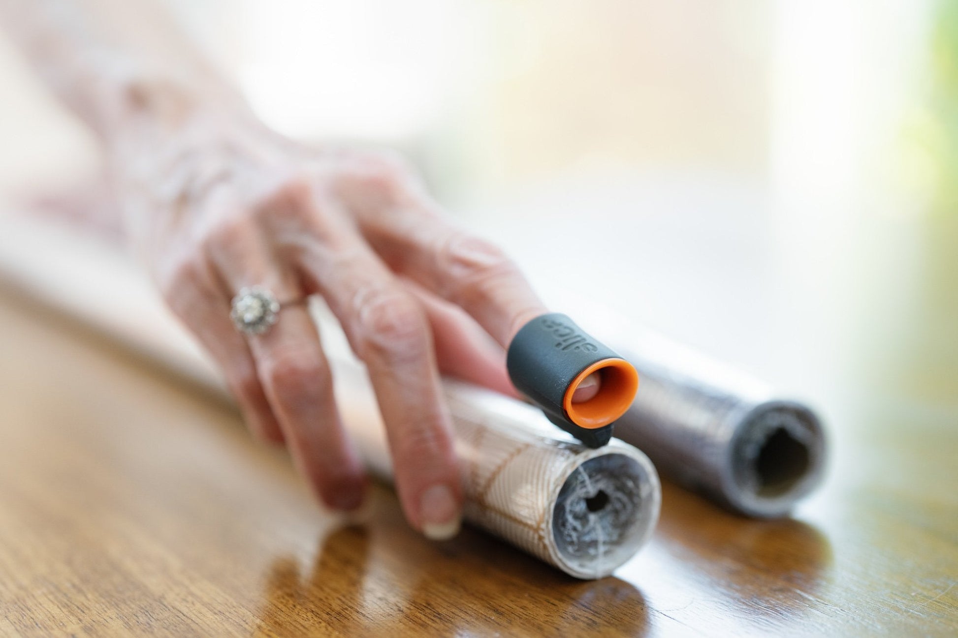Some ring knives have exposed blades while others use a hook design to grab and cut string. In almost all cases, the blade is oriented so that it extends from the top, or outside, of the hand. Slice’s version places its micro-ceramic blade under the finger pad for comfort, safety, and control.