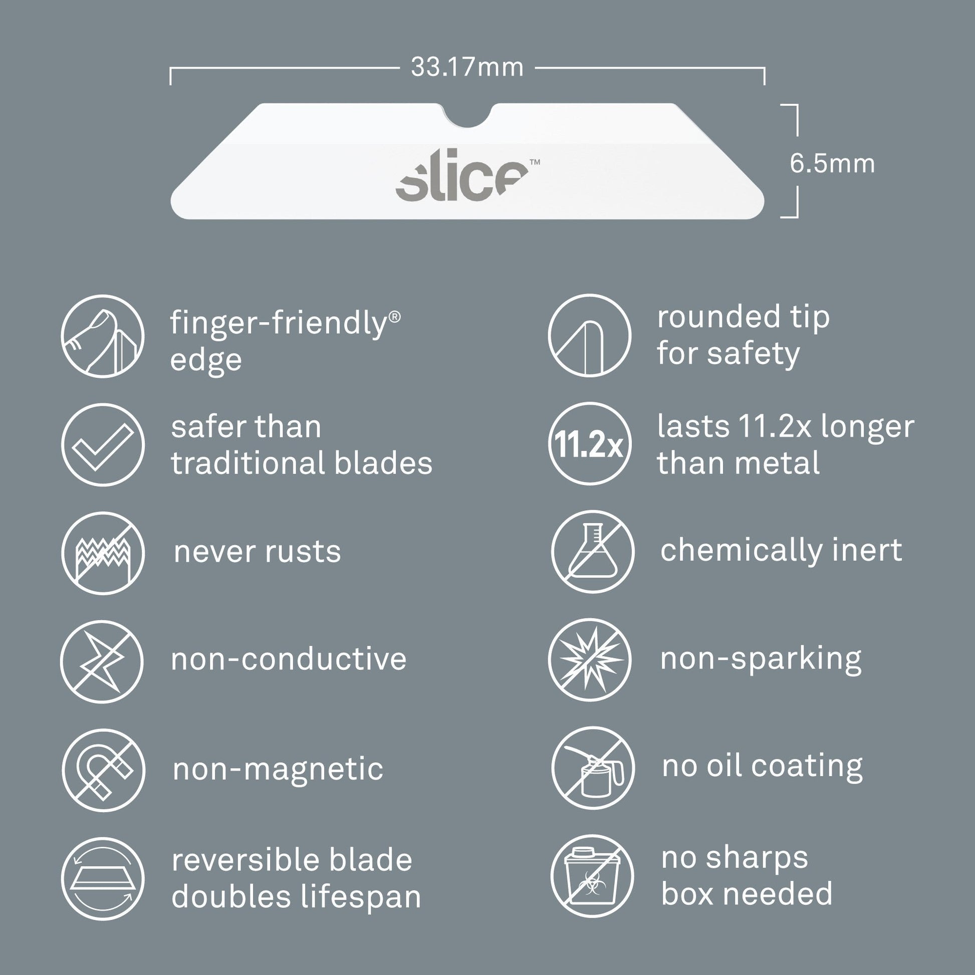 Slice® Box Cutter Blades (Rounded Tip) are compatible with multiple tools, including Slice pen cutters, box cutters, and mini cutters. These blades boast a finger-friendly® edge, with the rounded tip adding an extra level of protection against accidental injuries.