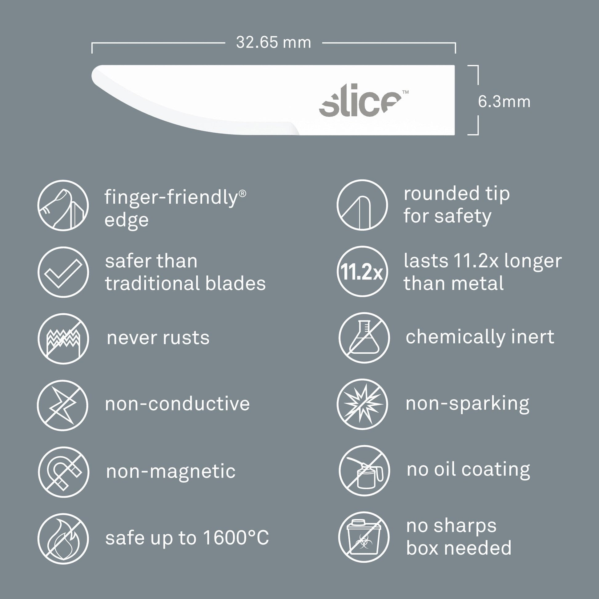 Slice® Craft Blades (Curved Edge, Rounded Tip) are compatible with multiple craft tools, including Slice craft knives, the Scalpel, and the Precision Knife. Designed to cut everything but you, these blades boast a finger-friendly® edge that never rusts.