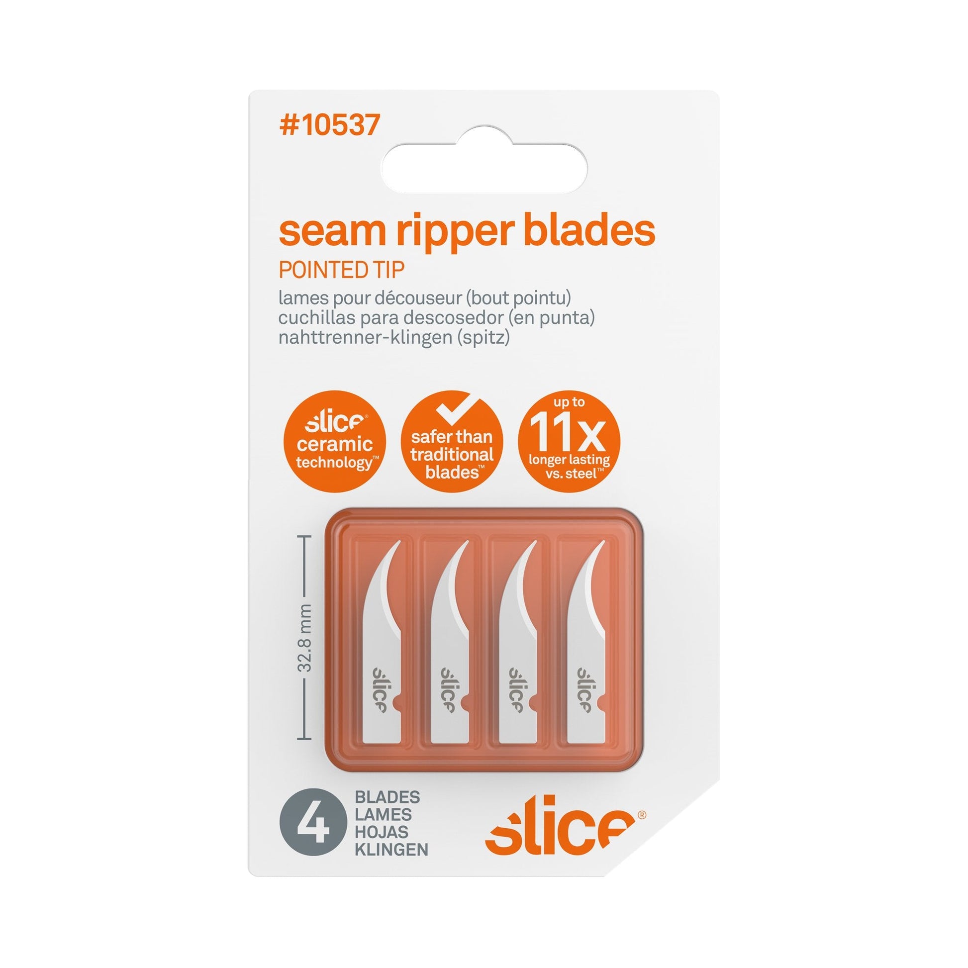 Slice® Seam Ripper Blades (Pointed Tip) are compatible with multiple tools, including Slice seam rippers, craft knives, the Scalpel, and the Precision Knife. Designed to cut everything but you, these blades boast a finger-friendly® edge that never rusts.